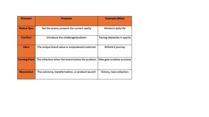 The Hero element for Surf, the laundry detergent, is the claim that they can wash 100% of claims is what they want to hero. For the design platform,Canva, the hero element is that non-designers can use it. They hero the fact that their platform is for non-designers.The Launch- What are you selling? What is it that you provide? What is the end result? Almost like the ending of any story. What happens at the end. For Nike. it could be a new product launch. Your product/launch/service could change. Your story must remain consistent. For an apparel brand, it could be a new collection.